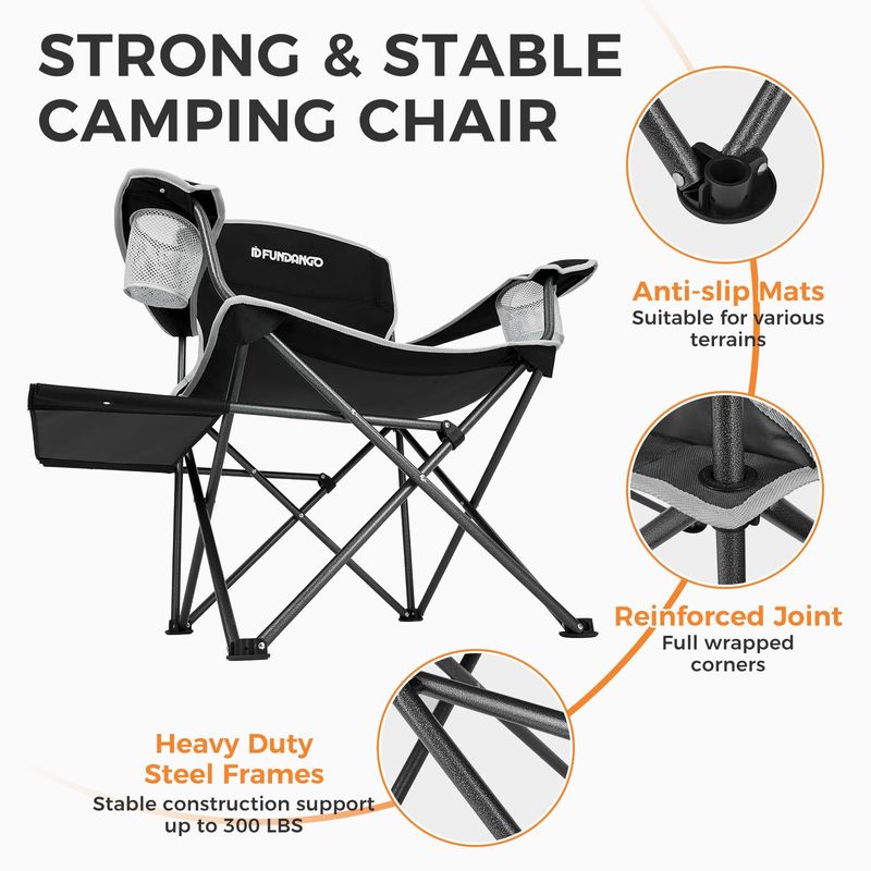 ?Duradero y resistente?La silla de campamento para exteriores FUNDANGO está hecha de tela Oxford 600D resistente a desgarros, proporcionando comodidad y durabilidad duraderas. El marco está hecho de tubo de acero resistente y tiene un diseño triangular, lo que garantiza una mayor estabilidad y soporta hasta 300 libras. Las patas antideslizantes lo hacen adecuado para su uso en la mayoría de superficies.