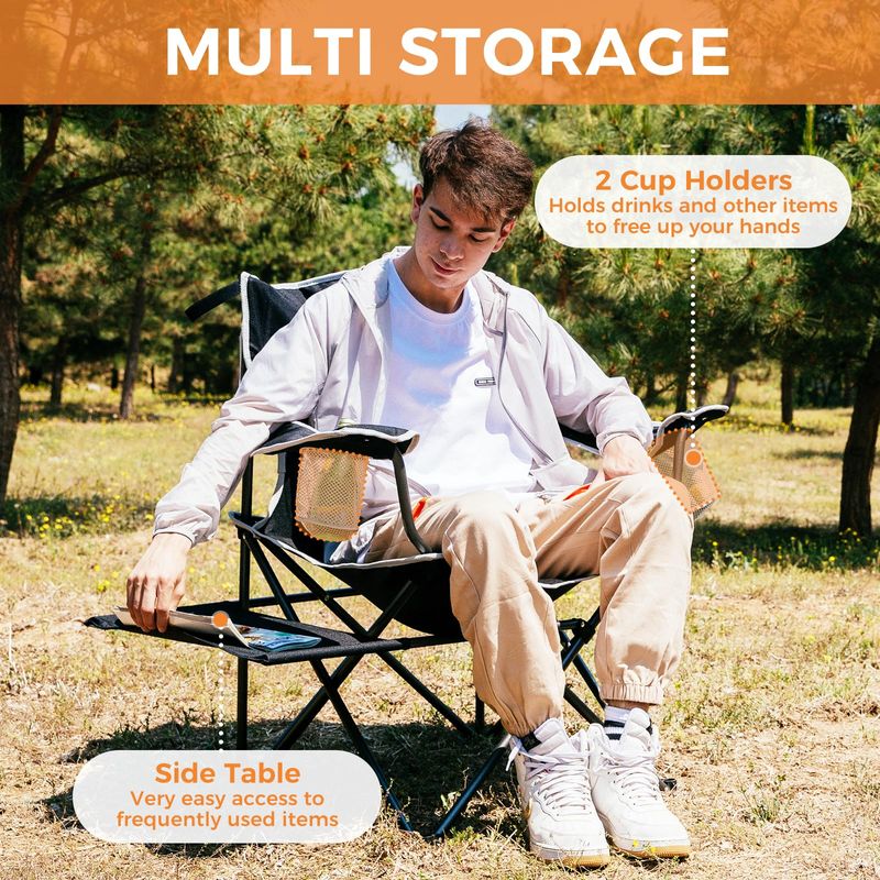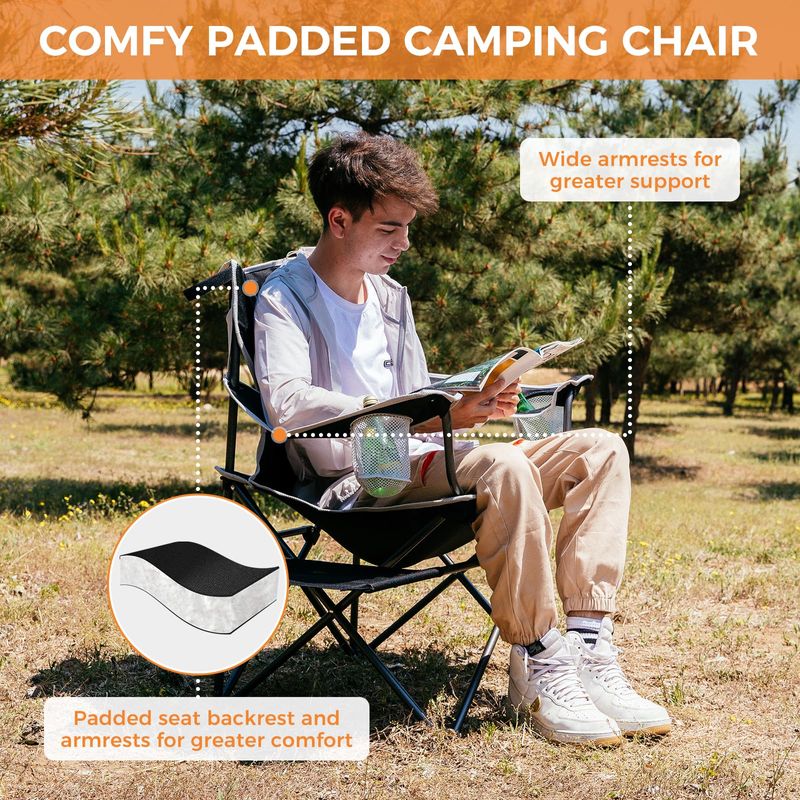 Comodidad mejorada: el diseño ergonómico de la silla de camping plegable ofrece la máxima comodidad, con un diseño de silla de gran tamaño que proporciona un amplio espacio, reposabrazos que sostienen tus brazos y un respaldo de algodón que amortigua tu espalda. El gran tamaño de la silla es particularmente adecuado para personas más grandes.