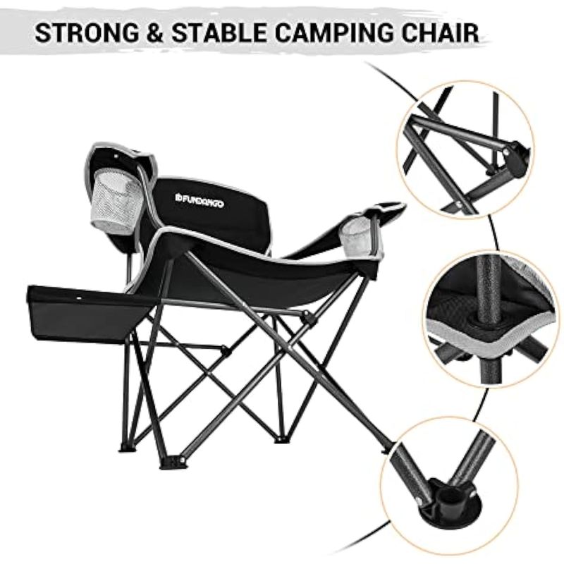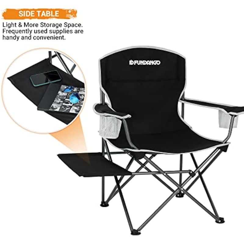 Comodidad mejorada: el diseño ergonómico de la silla de camping plegable ofrece la máxima comodidad, con un diseño de silla de gran tamaño que proporciona un amplio espacio, reposabrazos que sostienen tus brazos y un respaldo de algodón que amortigua tu espalda. El gran tamaño de la silla es particularmente adecuado para personas más grandes.