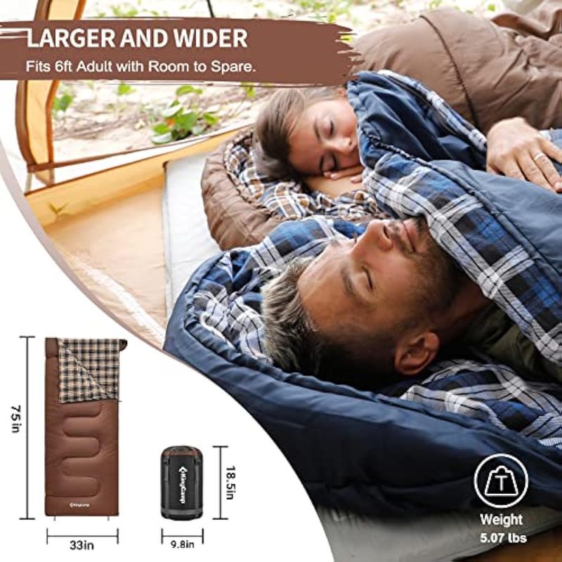 KINGCAMP COTTON FLANNEL SLEEPING BAG, BIG AND TALL SLEEPING BAGS FOR ADULTS COLD WEATHER, ZIP TOGETHER FOR 2P SLEEPING BAG FOR 3 SEASON, LIGHTWEIGHT, WATER RESISTANT FOR FAMILY CAMPING BACKPACKING