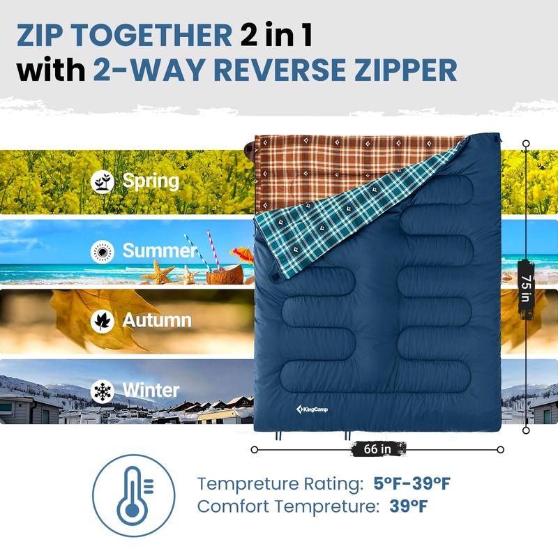 KINGCAMP COTTON FLANNEL SLEEPING BAG, BIG AND TALL SLEEPING BAGS FOR ADULTS COLD WEATHER, ZIP TOGETHER FOR 2P SLEEPING BAG FOR 3 SEASON, LIGHTWEIGHT, WATER RESISTANT FOR FAMILY CAMPING BACKPACKING