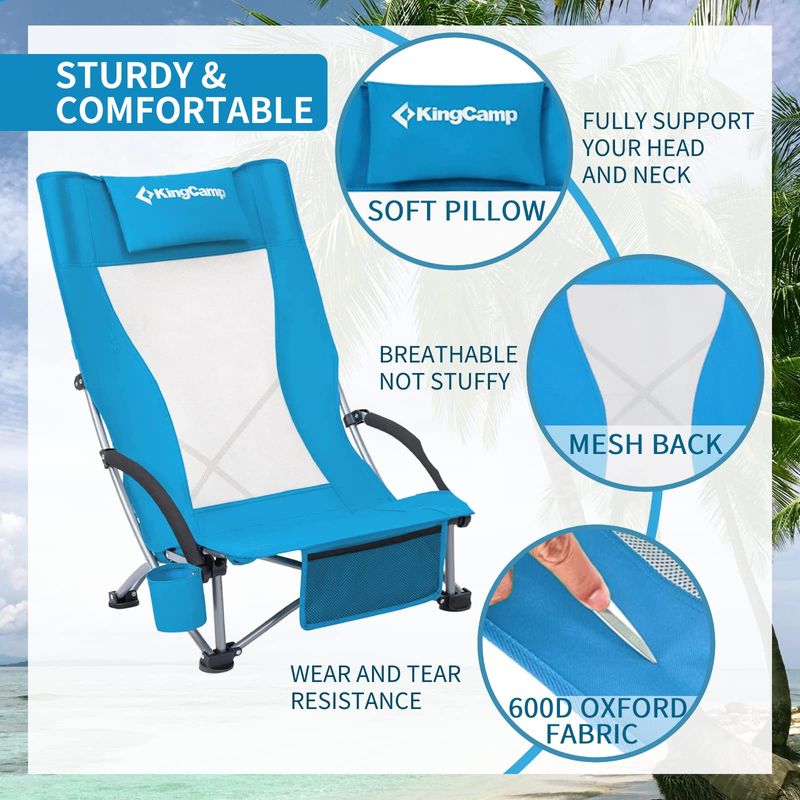 KINGCAMP PAQUETE DE 2 SILLAS DE PLAYA LIGERAS Y PLEGABLES CON RESPALDO ALTO CON SOPORTE PARA TAZAS, BOLSA DE ALMOHADA PARA ACAMPAR AL AIRE LIBRE, ARENA, CONCIERTO, CéSPED, FESTIVALES, DEPORTES, COLOR CIAN