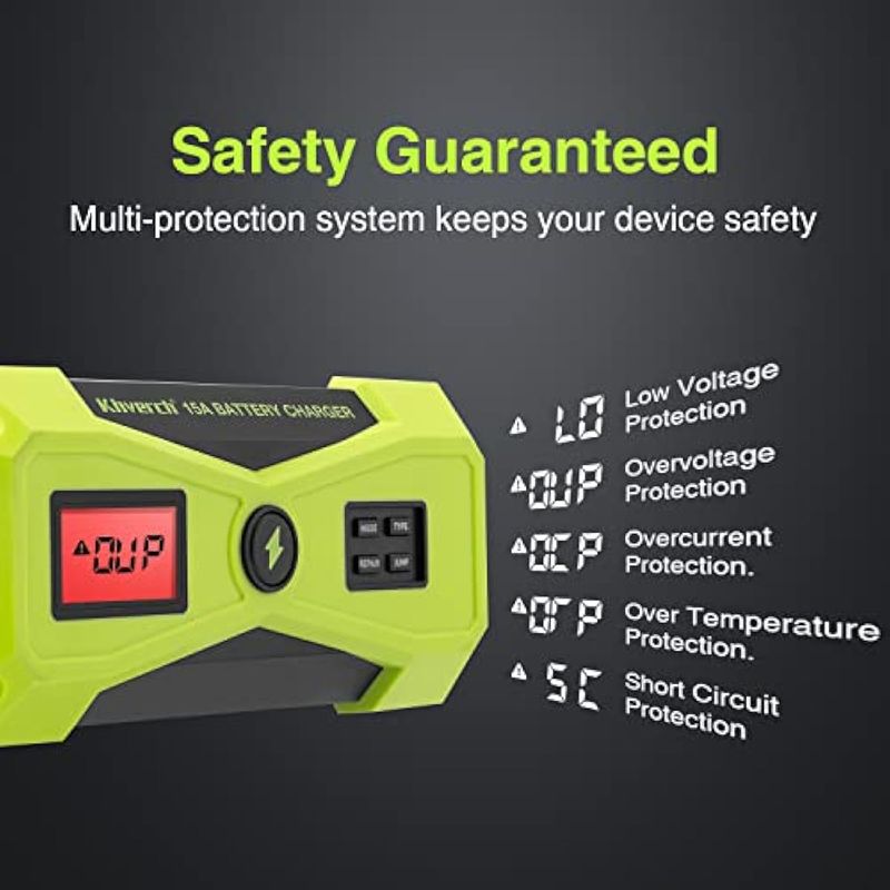 Múltiples modos: este mantenedor de batería está equipado con modos especiales, incluyendo modo frío, modo de refuerzo, modo de mantenimiento de batería, proporcionando soluciones de carga personalizadas para diferentes tipos de baterías. Usando el sistema de pantalla LCD, el cargador de batería del automóvil es claramente visible en la pantalla LCD que muestra el estado de carga y el estado de la batería.