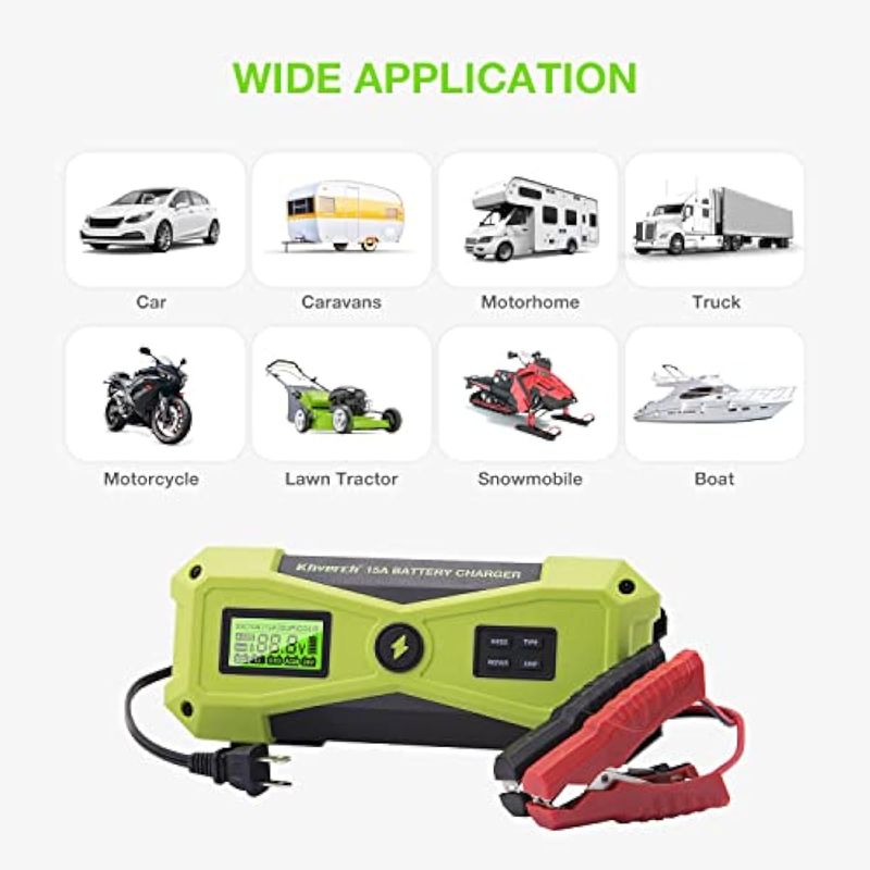[Amplia aplicación del cargador de baterías] Los cargadores de automóvil pueden cargar o reparar baterías en vehículos como autos de plomo ácido de 12 voltios24 voltios, marinas y barcos. El cargador de mantenimiento de batería Kinverch es una opción versátil para una amplia gama de vehículos, incluyendo automóviles, camiones, motocicletas, SUV, cortacésped, vehículos eléctricos, vehículos marinos, agrícolas, vehículos todoterreno, camionetas, barcos, etc. NOTA: No activará baterías completamente agotadas ni reparará baterías dañadas.