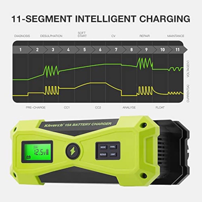 Cargador de batería para automóvil: este cargador de batería inteligente de 12 V24 V alcanza hasta un 85 de eficiencia. Compatible con todas las baterías de plomo-ácido y litio de 12 V y 24 V, incluyendo AGM, STD, GEL, SLA, Flooded WET, CA, EFB y LiFePO4. El cargador de energía del vehículo con corriente ajustable 2A10A15Aauto puede satisfacer sus diferentes requisitos de carga.