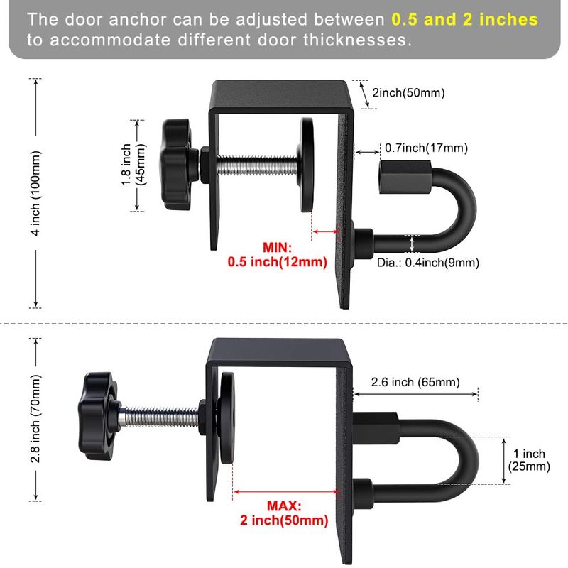 Fácil instalación: no hay necesidad de taladrar agujeros, sujetarlo en tu puerta y apretarlo a mano para completar la instalación. El gancho de puerta es adecuado para la mayoría de puertas. El espacio entre la puerta y el marco de la puerta debe ser superior a 18 pulgadas, que es aproximadamente el grosor de 3 tarjetas de crédito apiladas juntas. El anclaje de la puerta se puede instalar en la parte superior, inferior y lateral de la puerta.