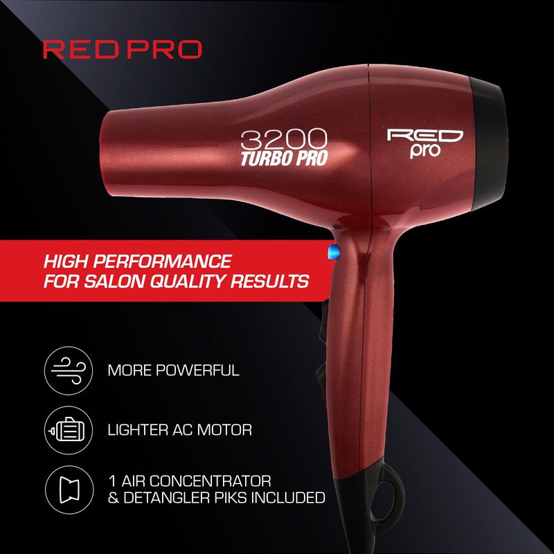 Kiss Productos Red Pro 3200 Turbo Pro Detangler Secador de CA con 3 accesorios de peinado