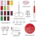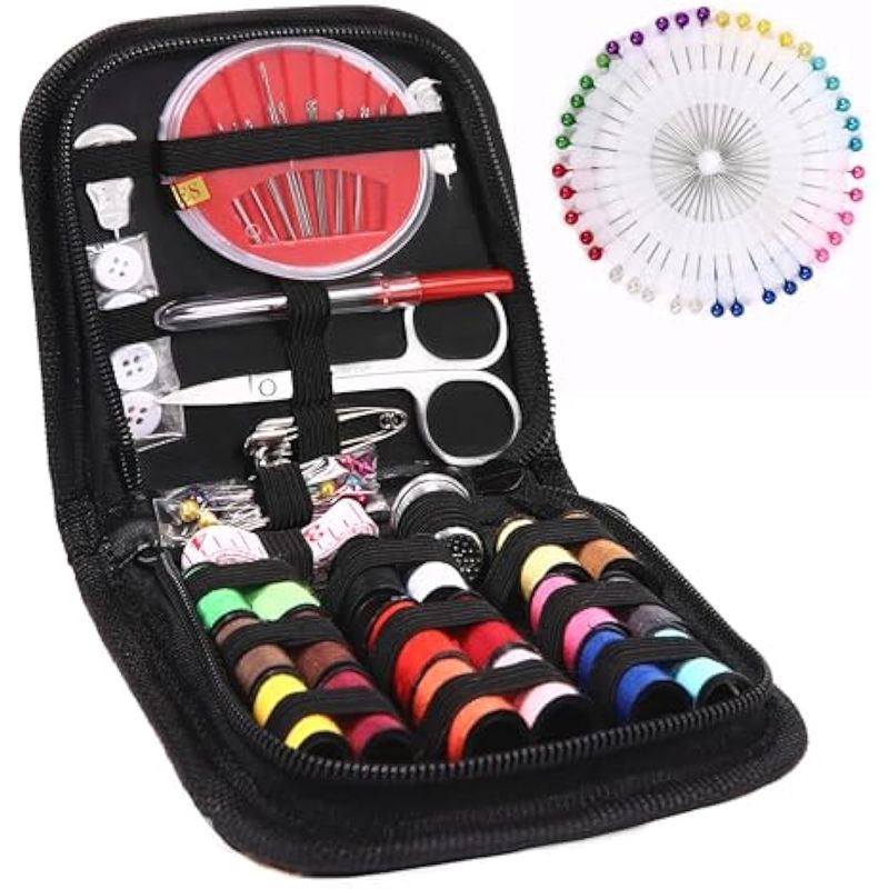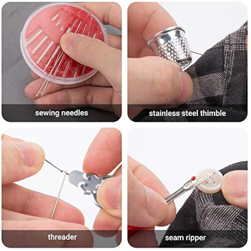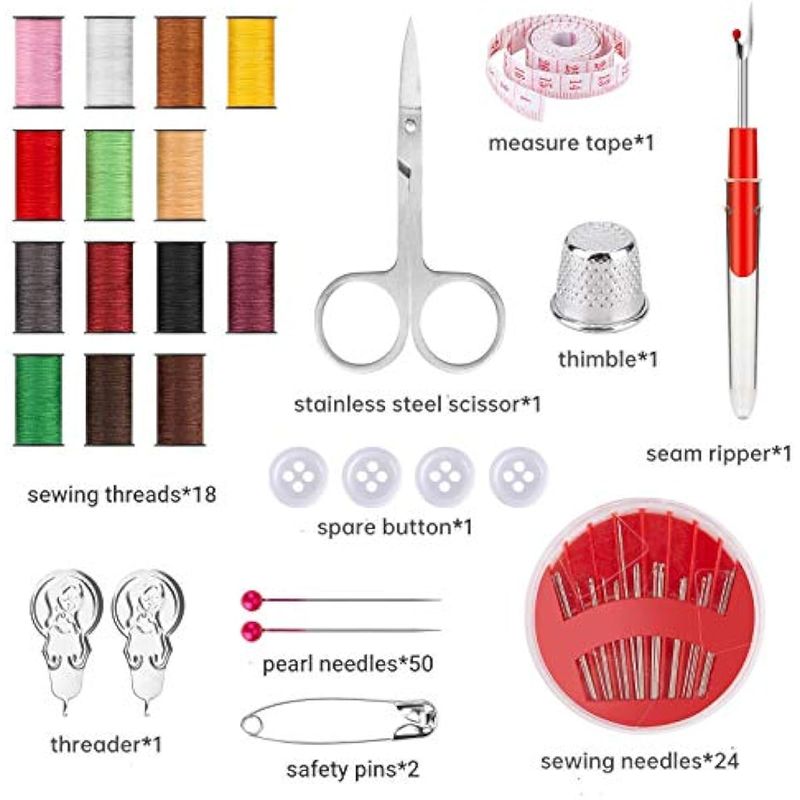 2. El paquete incluye: 24 agujas, 18 carretes de hilo, 50 alfileres de perlas, 2 x alfileres de seguridad, 4 x botones de camisa blanca, 2 x amasadores premium, 1 dedal de acero niquelado, 1x tijeras de acero inoxidable, 1 x desgarrador de costura, 1 x cinta métrica, 1 x bolsa de almacenamiento.