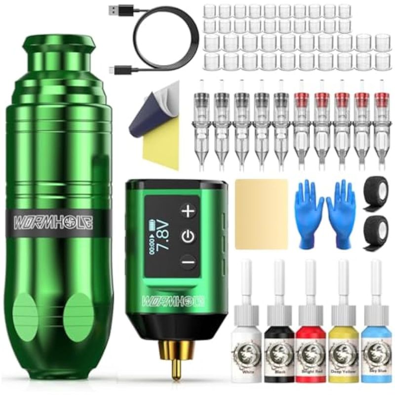 Kit de pistola de tatuaje, kit de máquina de tatuaje inalámbrica de agujero de gusano, kit de