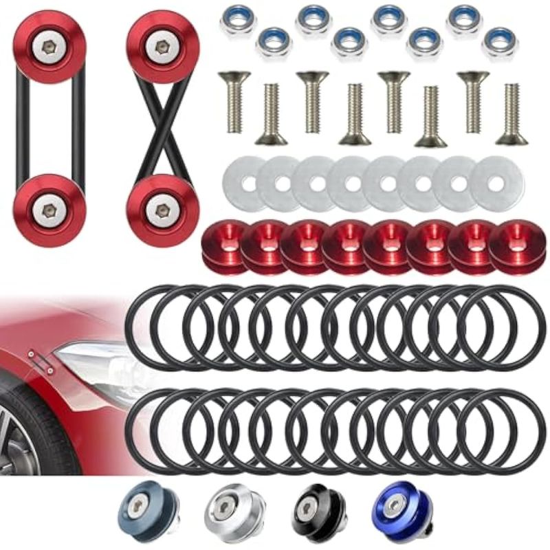 Paquete completo: El kit incluye 8 pestañas de liberación rápida de parachoques rojas, 8 pernos de acero inoxidable, 8 tuercas, 8 arandelas y 24 juntas tóricas NBR personalizadas 20 para uso de reemplazo.