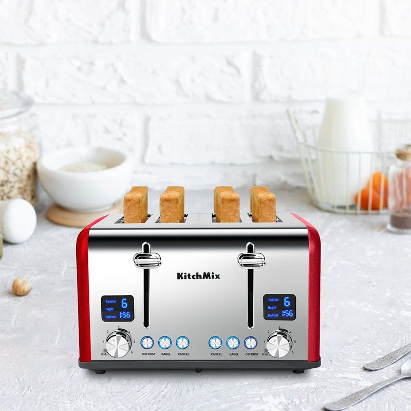 KITCHMIX TOSTADORA DE 4 REBANADAS, TOSTADORA DE ACERO INOXIDABLE CON TEMPORIZADOR LCD, RANURAS EXTRA ANCHAS, PANTALLA DOBLE, BANDEJA DE EXTRACCIóN DE MIGAS (GRIS)