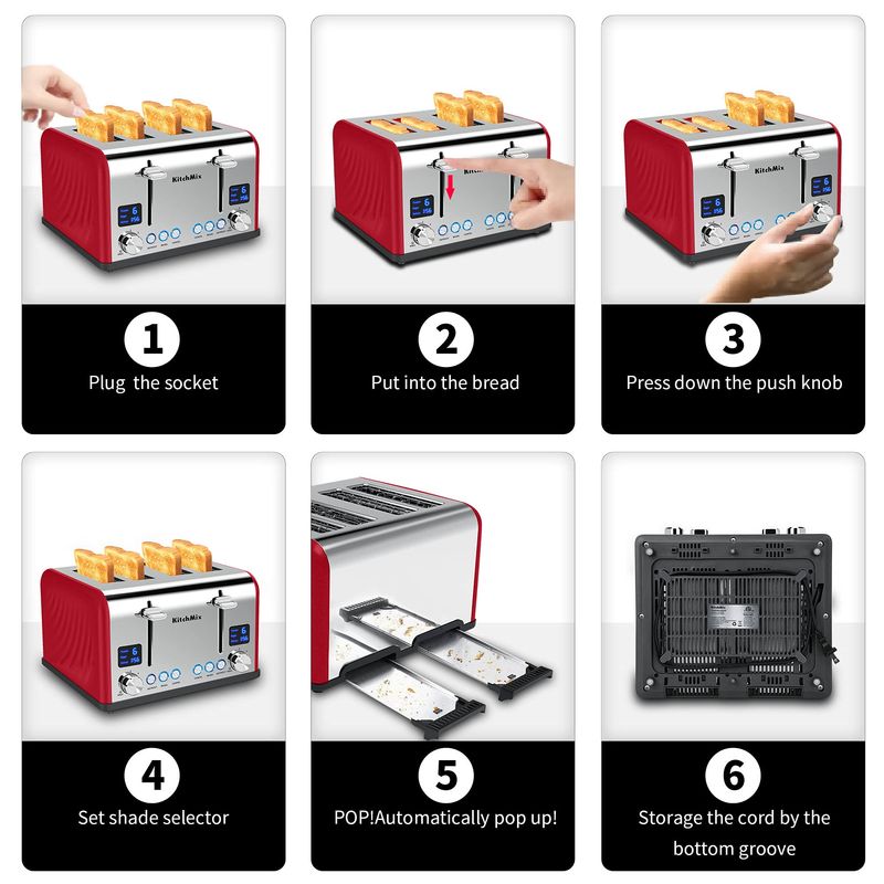 Palanca manual de alta elevación: la palanca de esta tostadora de 4 rebanadas se puede levantar más alto para llegar a los panes tostados. Puedes empujar los productos más alto de lo que naturalmente se sientan después de reventar