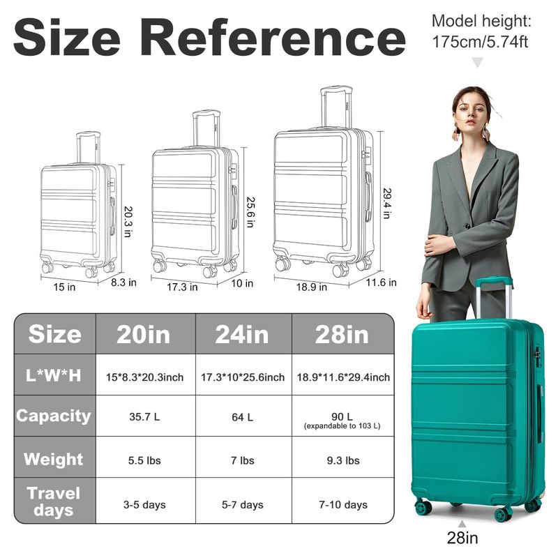 Dimensiones del equipaje giratorio de 20 pulgadas: total: 21.7 x 15.7 x 8.7 pulgadas. Embalaje: 20" x 14" x 8". Peso: 5.7 lbs. CAPACIDAD: 38L. El equipaje de mano internacional de Kono maximiza nuestra potencia de embalaje y cumple con la mayoría de las restricciones de tamaño de equipaje de mano para aquellos que viajan a nivel nacional y buscan mantenerse ligeros. Adecuado para viajes de 3 a 5 días