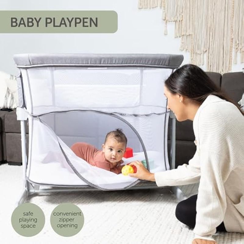 KOOLABABY CUNA 3 EN 1, CAMA DE NOCHE Y CORRALITO, MALLA TRANSPIRABLE, CUNA PORTáTIL FáCIL DE PLEGAR (GRIS)
