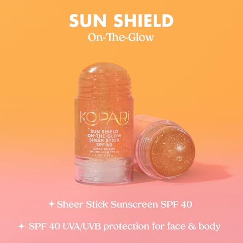 KOPARI SUN SHIELD ON-THE-GLOW - PROTECTOR SOLAR TRANSPARENTE SPF 40, RESISTENTE AL SUDOR Y AL AGUA, PROTECTOR SOLAR ENROLLABLE PARA CARA Y CUERPO CON VITAMINA E Y BISOBOLOL, 1 ONZA
