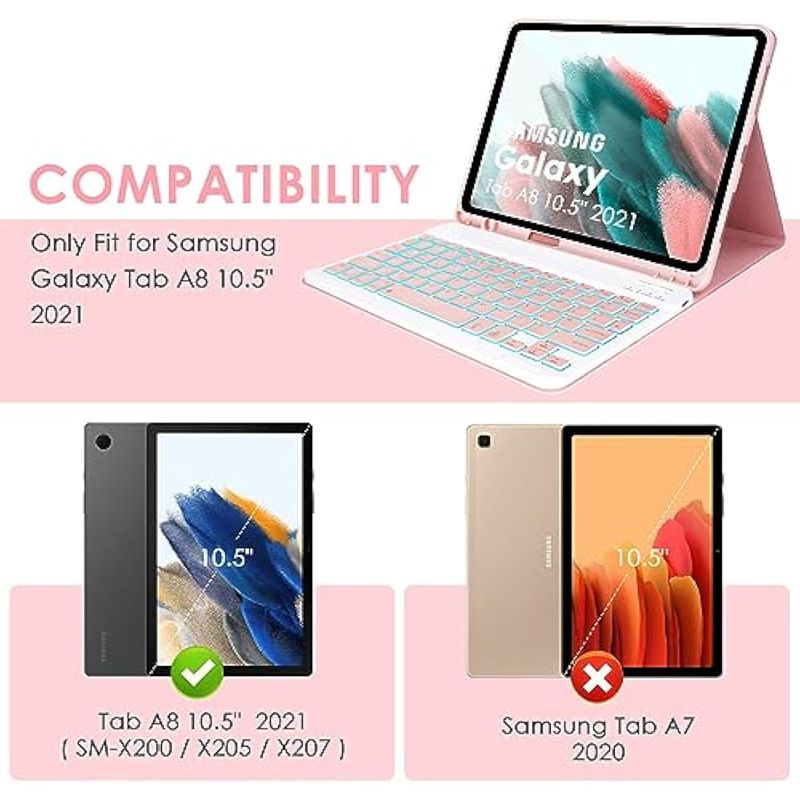 Funda con teclado retroiluminado para Samsung Galaxy A8 Tab: esta funda de teclado está diseñada exclusivamente para Samsung Tab A8 de 10.5 pulgadas 2021 SM-X200X205X207. NOTA: Comprueba el número de modelo de tu tableta en la parte posterior de la pestaña Galaxy antes de comprar.
