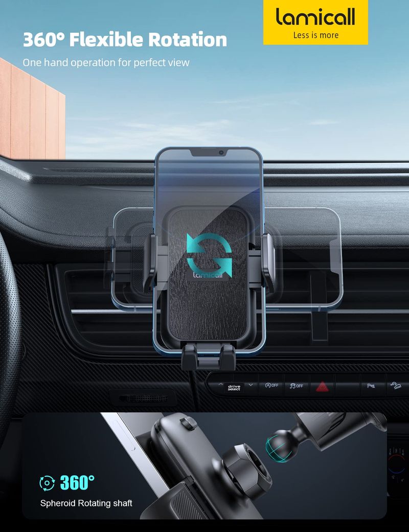 Estabilidad mejorada con protección de 4 bloqueos: el soporte Lamicall para teléfono celular en vehículo cuenta con una innovadora protección de 4 bloqueos y es compatible con rejillas de ventilación verticales y horizontales del automóvil, asegurando una excelente estabilidad incluso durante giros bruscos o carreteras con baches. Nota: Rango de extensión de gancho de 0.394 in-1.142 in. El grosor de la cuchilla de ventilación es inferior a 0.165 in. No apto para ventilación redonda.