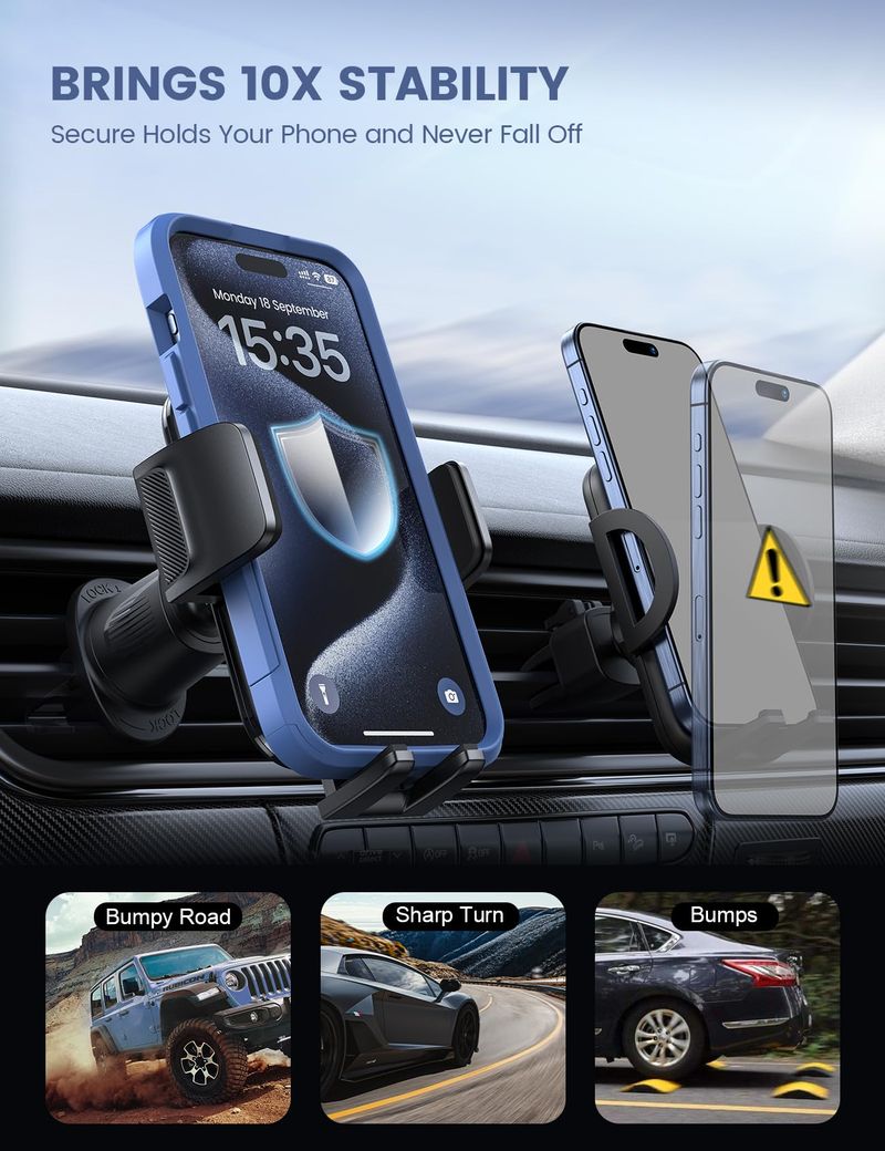 Estabilidad mejorada con protección de 4 bloqueos: el soporte Lamicall para teléfono celular en vehículo cuenta con una innovadora protección de 4 bloqueos y es compatible con rejillas de ventilación verticales y horizontales del automóvil, asegurando una excelente estabilidad incluso durante giros bruscos o carreteras con baches. Nota: Rango de extensión de gancho de 0.394 in-1.142 in. El grosor de la cuchilla de ventilación es inferior a 0.165 in. No apto para ventilación redonda.