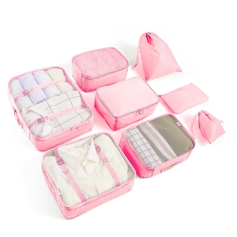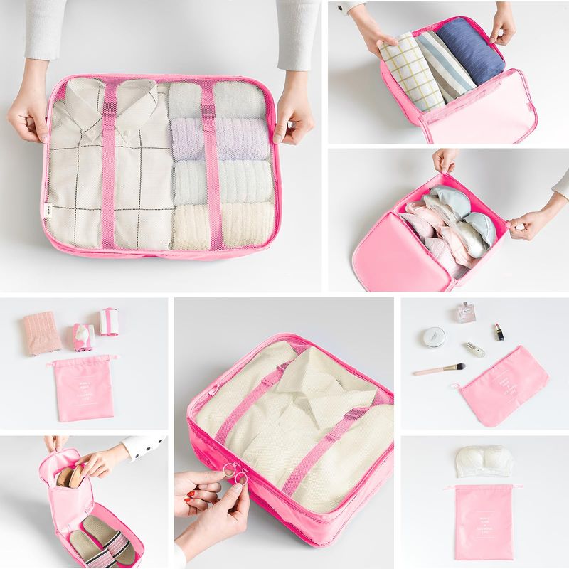?Juego de 8 piezas de gran capacidad?Los diferentes tamaños de bolsas esenciales de viaje pueden almacenar ropa clasificada, ropa sucia, sujetadores, ropa interior, calzado, cosméticos, toallas, artículos de aseo personal y accesorios electrónicos. Es un buen compañero de viaje.