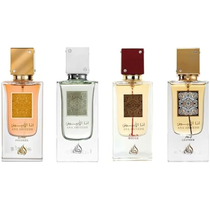 Ana Abiyedh de Lattafa Perfumes es una fragancia para mujeres y hombres. Las notas de salida son bergamota y naranja; las notas medias son vainilla y pera; las notas de fondo son almizcle y ámbar. Ana Abiyedh Rouge de Lattafa Perfumes es una fragancia Woody Spicy para mujeres y hombres. Ana Abiyedh Rouge se lanzó en 2016. Las notas de salida son Nashi Pear, Kumquat y Bergamota; las notas medias son Caramelo y Geranio; las notas de fondo son ámbar gris, almizcle y musgo de roble. Ana Abiyedh Leather by Lattafa Perfumes es una fragancia de cuero para mujeres y hombres. Ana Abiyedh Leather se lanzó en 2017. Las notas de salida son bayas de enebro, cardamomo, pimienta rosa y frambuesa; las notas medias son Iris, jengibre y rosa; las notas de fondo son cuero, almizcle blanco y ámbar. Ana Abyedh Poudrée de Lattafa Perfumes es una fragancia floral para mujeres. Esta es una nueva fragancia. Ana Abyedh Poudrée se lanzó en 2023. Las notas de salida son Azahar, Rosa y Jazmín; la nota media es almizcle; las notas de fondo son vainilla, haba tonka, vetiver, cedro y pachulí.