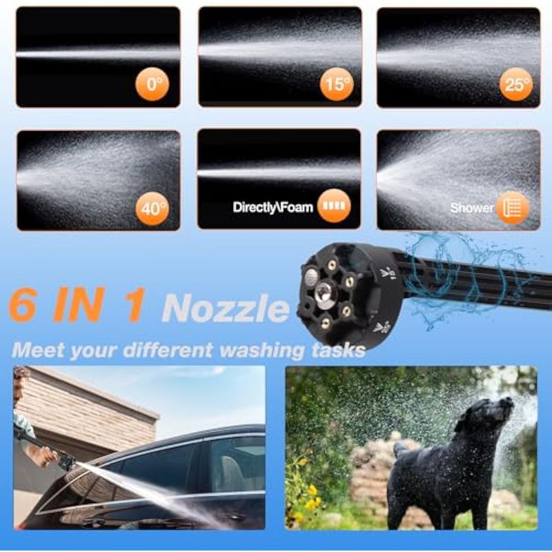 Boquilla versátil 6 en 1: la boquilla de lavado a presión ofrece seis modos funcionales: 0°15°25°40°modo de chorro recto espumamodo de ducha, atendiendo a diferentes necesidades de limpieza. Cuanto menor sea el ángulo, más fuerte es el impacto; cuanto mayor sea el ángulo, más amplia será la cobertura del rociado. El diseño 6 en 1 te permite cambiar entre escenarios sin quitar la boquilla, mejorando en gran medida la comodidad.