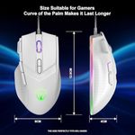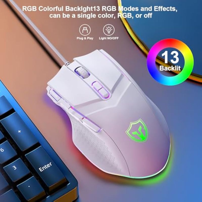 13 modos de iluminación RGB diferentes: el mouse para juegos de PC tiene 13 luces RGB ajustables, tira arcoíris con colores RGB cambiables, puedes cambiar el modo de iluminación haciendo clic en el botón, puede ser de un solo color, RGB o apagado la luz se apaga cuando se pulsa el botón decimocuarta vez, las luces RGB son más vibrantes que los ratones básicos iluminados, las luces multicolores combinan en gran medida con tu estilo, te proporcionan un ambiente de juego elegante y resaltan tu ambiente de juego.