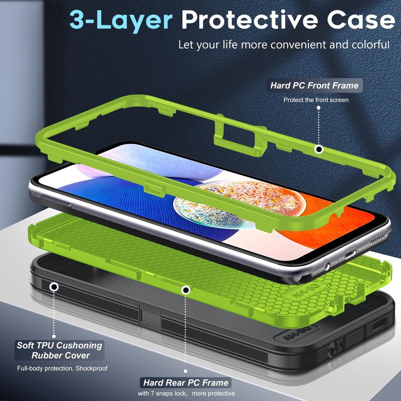 Diseño de precisión: increíble diseño desmontable 3 en 1, bordes delanteros elevados y bordes de lente que ofrecen una fuerte protección para tu funda Galaxy A14 0.18 oz cuando se cae y en el uso diario, y también el puerto de carga tiene una cubierta para evitar que el polvo caiga.
