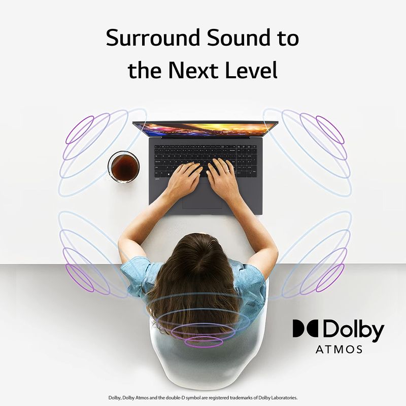 Dolby Atmos - Dolby Atmos es un formato de audio patentado que aporta el mismo sonido envolvente de 360 grados que obtienes en una sala de cine a tu LG gram. Escucha y siente más música y películas a través de Dolby Atmos y déjate llevar por la experiencia de sonido envolvente envolvente.