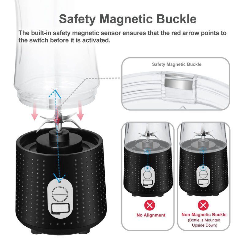 Garantiza tu seguridad: el interruptor magnético seguro integrado hará que estas licuadoras personales dejen de mezclarse cuando la parte de la taza de la licuadora portátil y la base de la licuadora no estén montadas firmemente o correctamente. Y seleccionamos estrictamente sin BPA de esta licuadora portátil de batidos, lo que te permite hacer jugos, batidos de alimentos para bebés y otras cosas de mezcla sin preocupaciones.