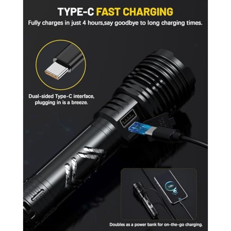 Carga rápida y cómoda tipo C: di adiós a los largos tiempos de carga con nuestra función de carga rápida tipo C. La carga completa de la linterna tarda solo 4 horas. La interfaz tipo C de doble cara hace que enchufar sea muy fácil. Además, funciona como un banco de energía, lo que le permite cargar sus otros dispositivos sobre la marcha.