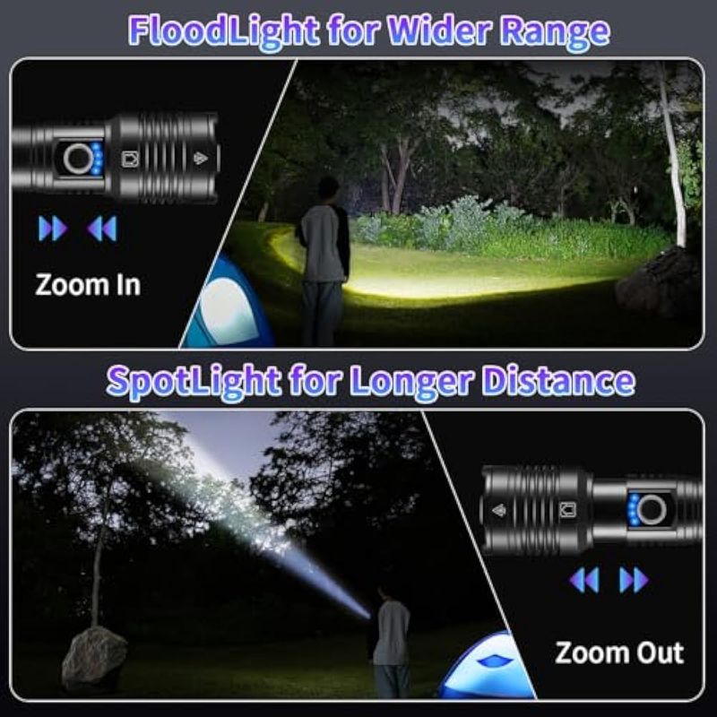 Linternas recargables de alto lúmenes: las linternas LiupTiuo de alto lúmenes equipadas con chip LED de alta potencia mejorado, pueden proporcionar brillo de hasta 990.000 lúmenes. Nuestras linternas recargables superbrillantes con cuentas LED superbrillantes pueden iluminar objetos lejos de 1,000 pies de distancia.