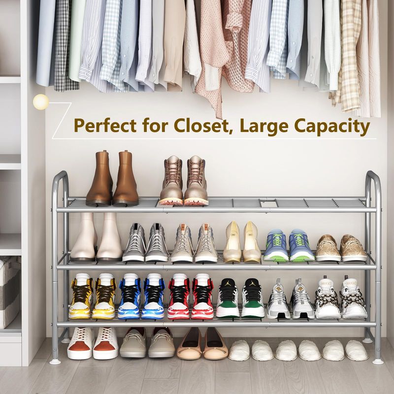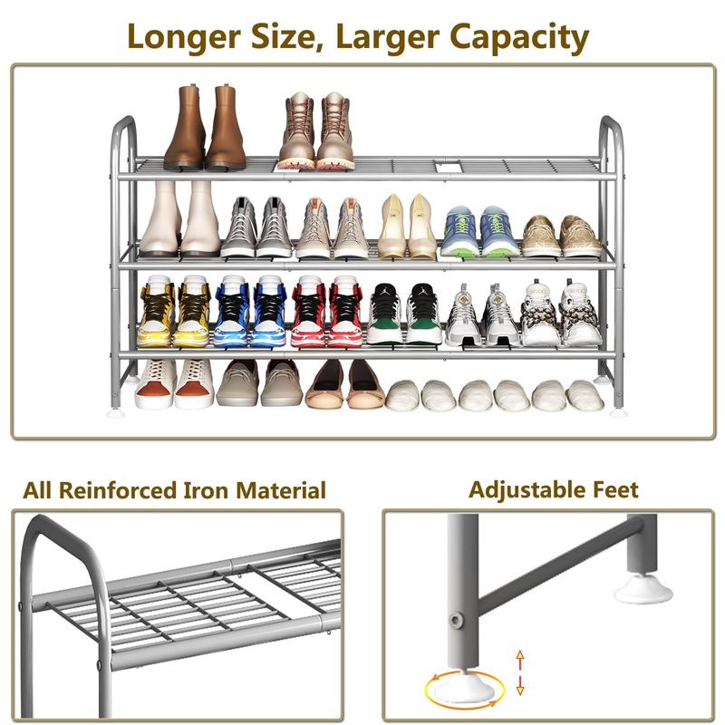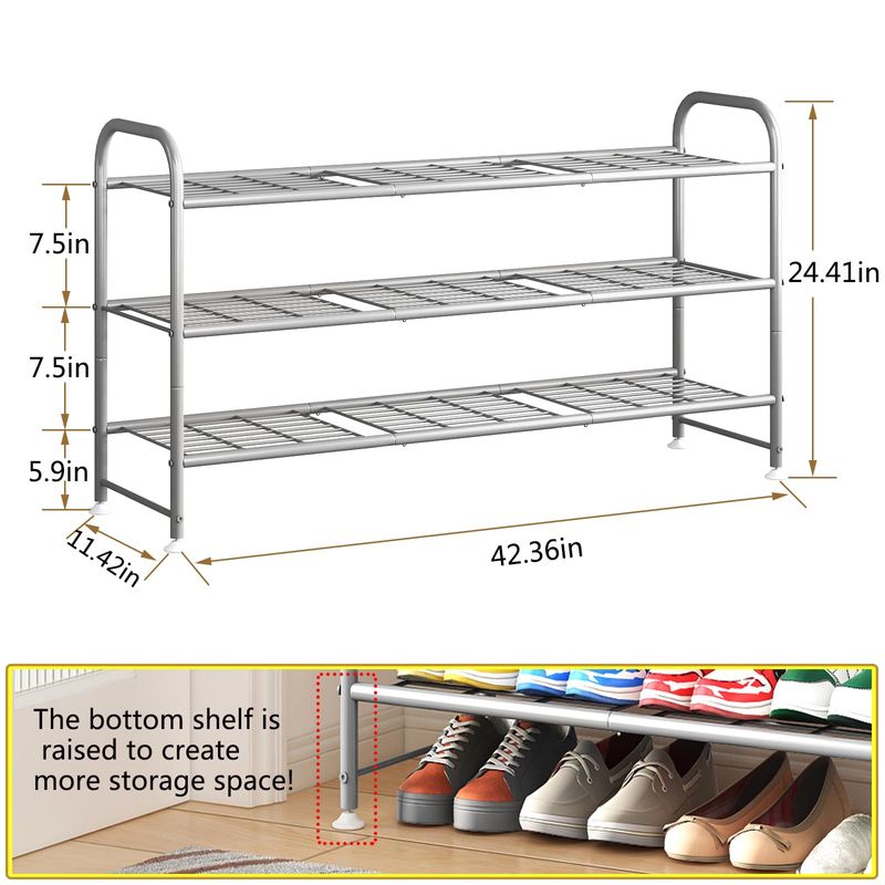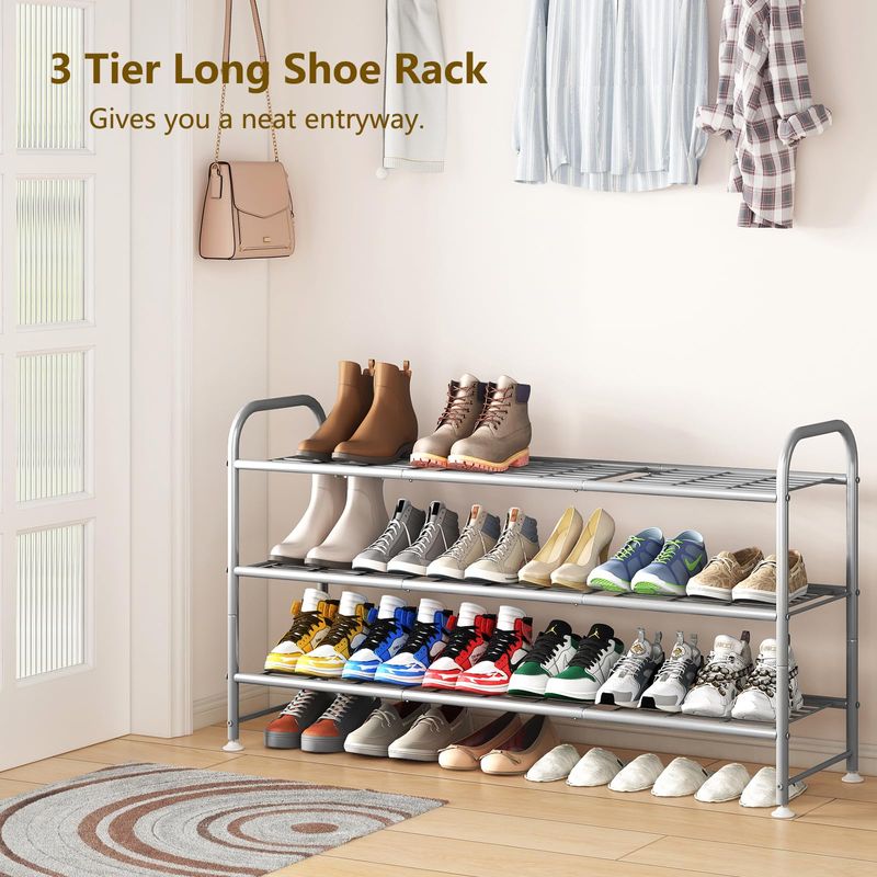 Gran capacidad: este zapatero largo de 3 niveles puede almacenar fácilmente hasta 20-24 pares de zapatos para mujeres, hombres y niños, como pantuflas, sandalias, tacones altos, tenis, botas, etc. La parte inferior elevada crea espacio de almacenamiento adicional para más zapatos, ideal como zapatero para armario.