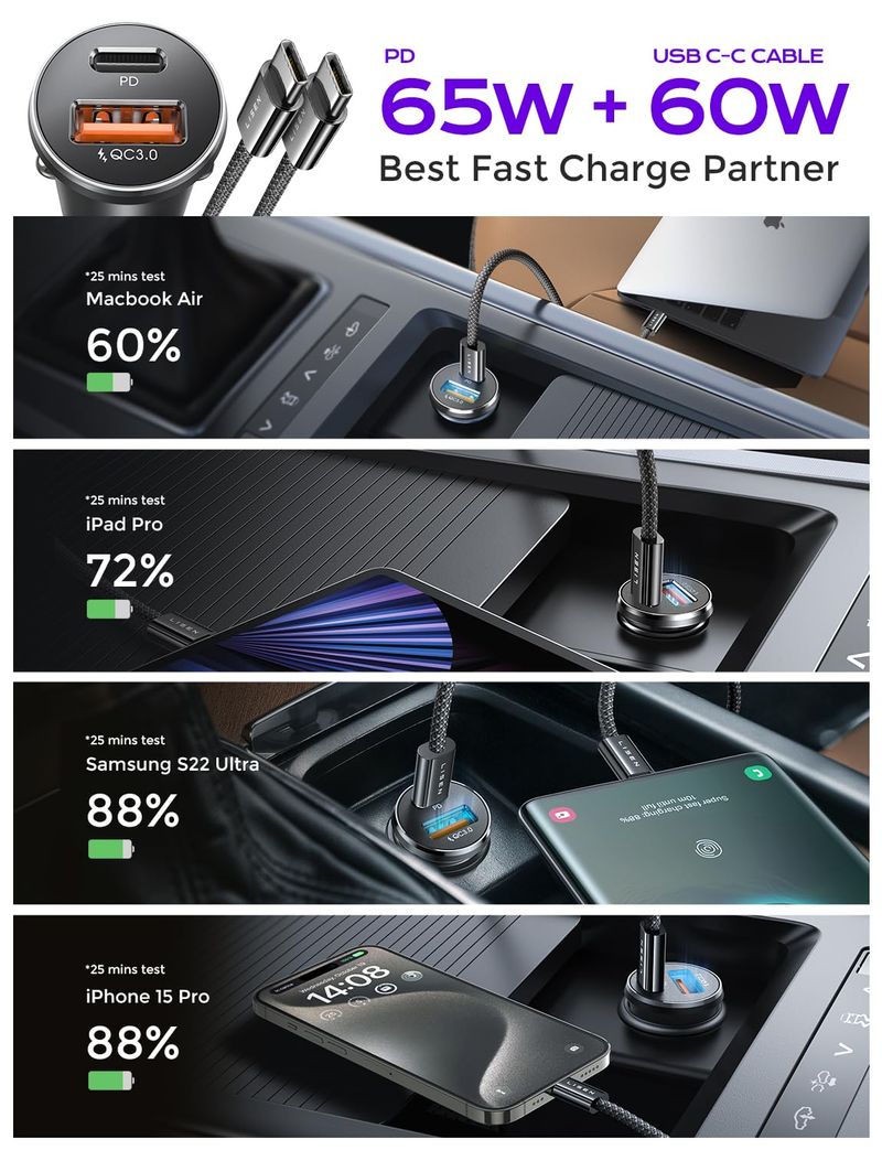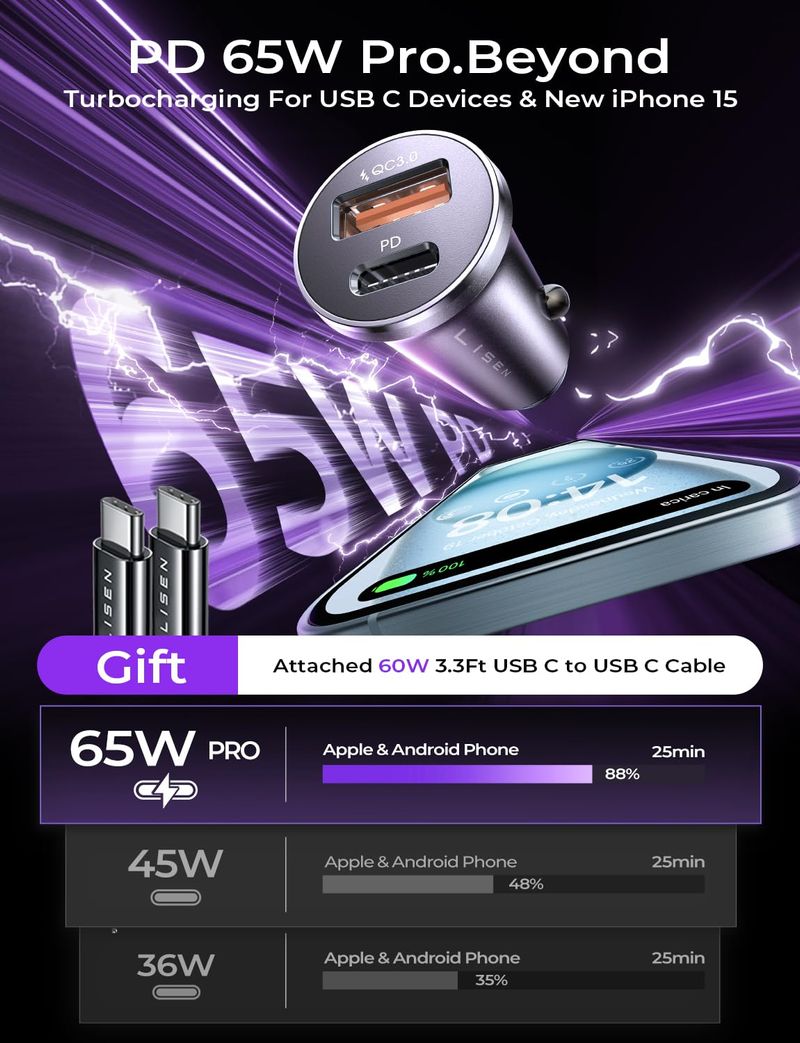 ? Carga PD súper rápida de 65 W: cargador de coche USB C súper rápido adaptador de coche con nueva actualización PD 65W puede cargar iPhone 15 Pro Max Plus 1413 12 series hasta un 88 y iPad hasta un 60 a 35 minutos. Y también es compatible con Samsung PPS carga súper rápida para S23222120.