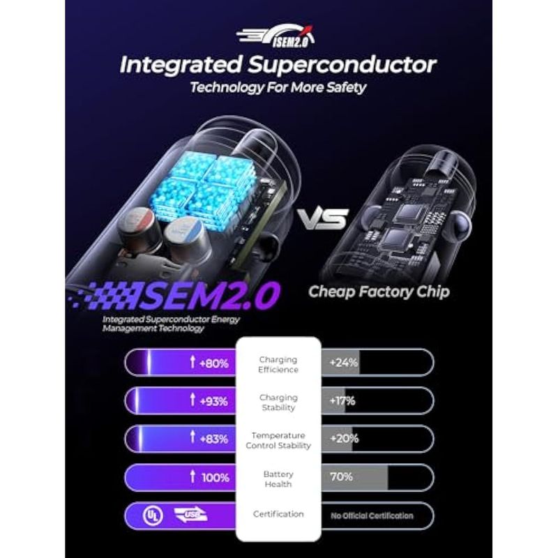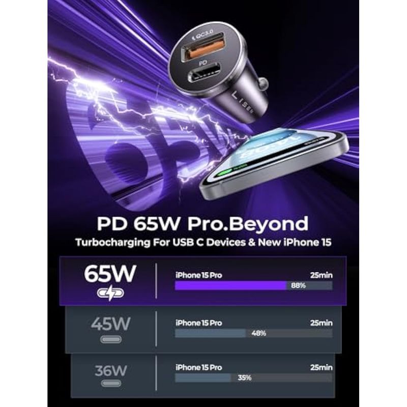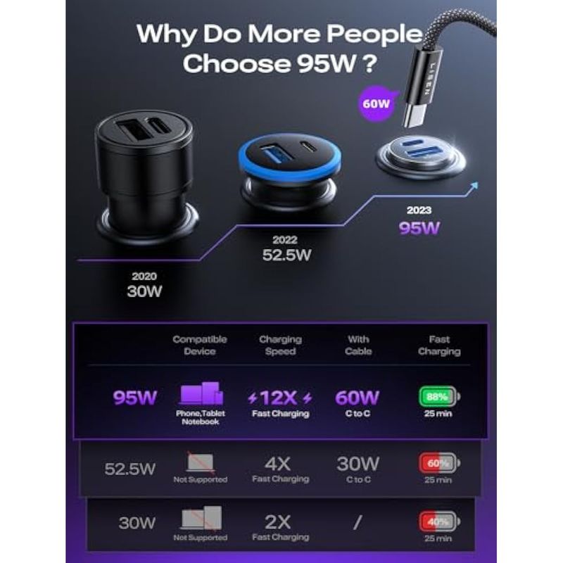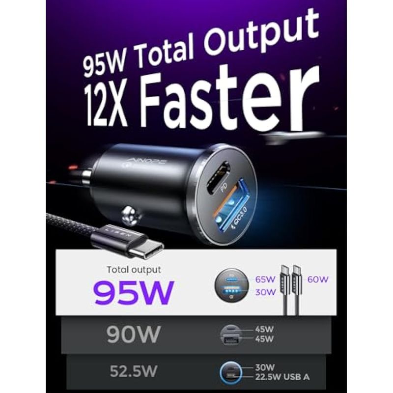 LISEN Adaptador de cargador de coche USB C de carga rápida de 95 W [todo metal] Cargador USB de