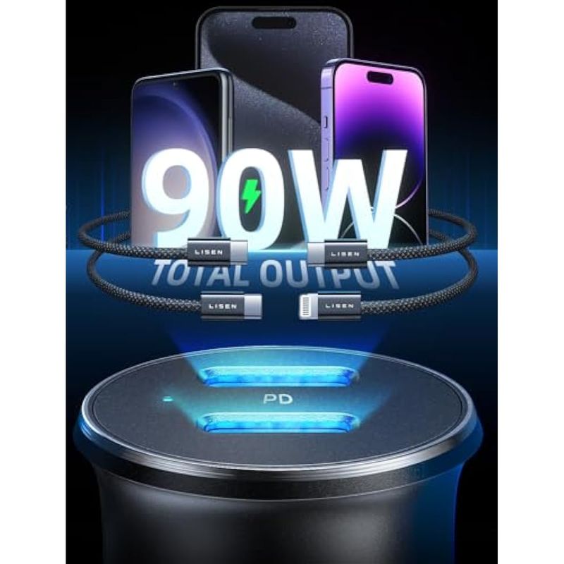 LISEN CARGADOR DE COCHE USB C DE 90 W, PUERTO USB C DUAL PD45W, CARGADOR DE COCHE PARA IPHONE, CARGA RáPIDA, MINI CARGADOR DE COCHE USB C CON CABLE USB C Y CABLE LIGHTNING PARA IPHONE 15 PRO MAX 14 13 GALAXY S23/22 PIXEL IPAD PRO