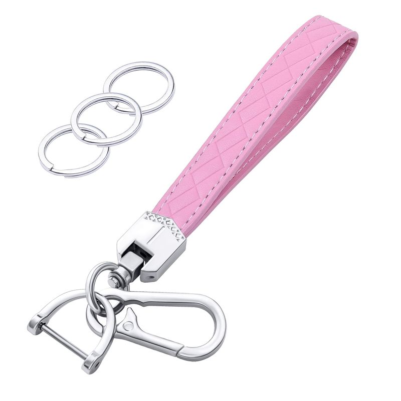 Llavero de piel con 3 llaveros y anillo en D antipérdida, Rosado/Plateado