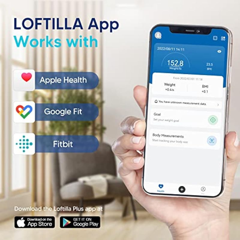 Simple y fácil: viene con baterías. Instálelos y use la báscula inteligente ahora mismo. Con tecnología Step-on y autocalibración, puedes simplemente pisar la báscula LOFTILLA IMC para pesarte y leer fácilmente tus pesos en el LED grande. Mantenga su teléfono conectándose a la báscula corporal mientras pesa, luego verá sus otros 13 datos de composición corporal en la aplicación justo después de realizar la medición.