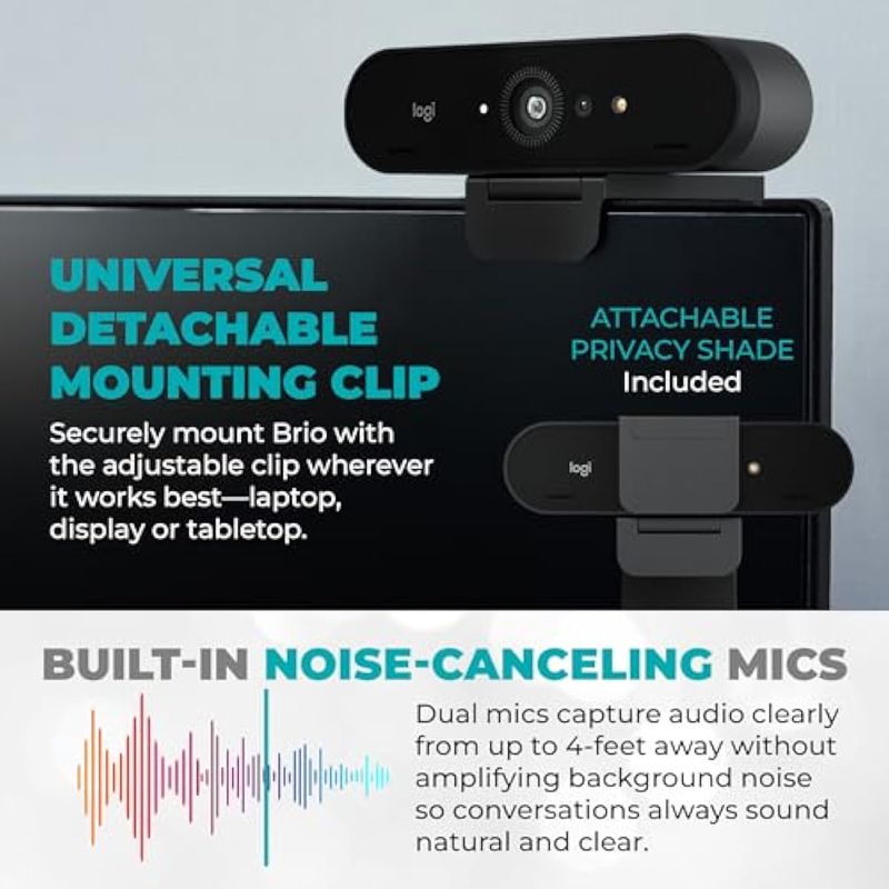 LOGITECH BRIO - CáMARA WEB 4K ULTRA HD CON MICRóFONO [úLTIMA VERSIóN] PARA ESCRITORIO CON TRíPODE Y MONTAJE UNIVERSAL - CáMARA WEB LOGITECH USB PARA COMPUTADORA - CáMARA WEB ULTRA PRO GRAN ANGULAR PARA TRANSMISIóN O JUEGOS