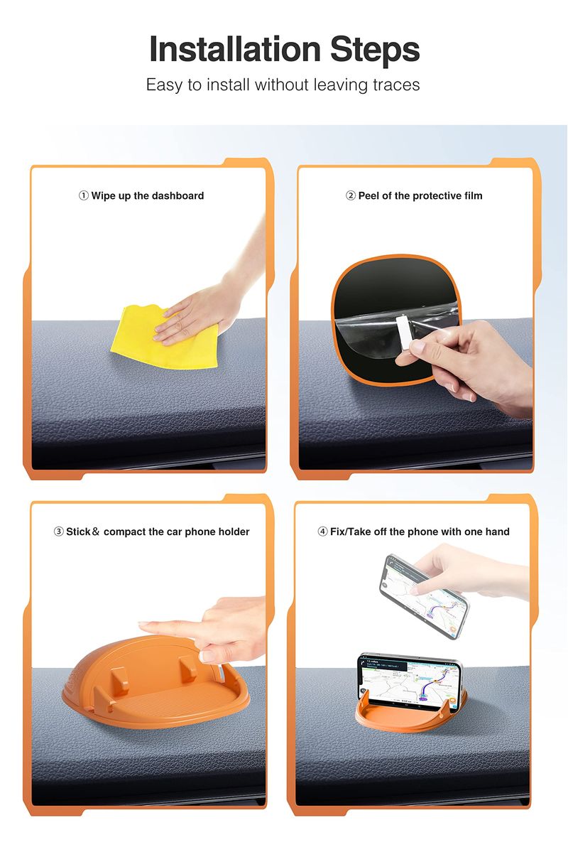 Consejos de uso: retira la película adhesiva en la parte inferior del soporte del teléfono del coche y asegúrate de que la superficie del salpicadero de tu coche esté seca y limpia sin polvo antes de colocar el soporte