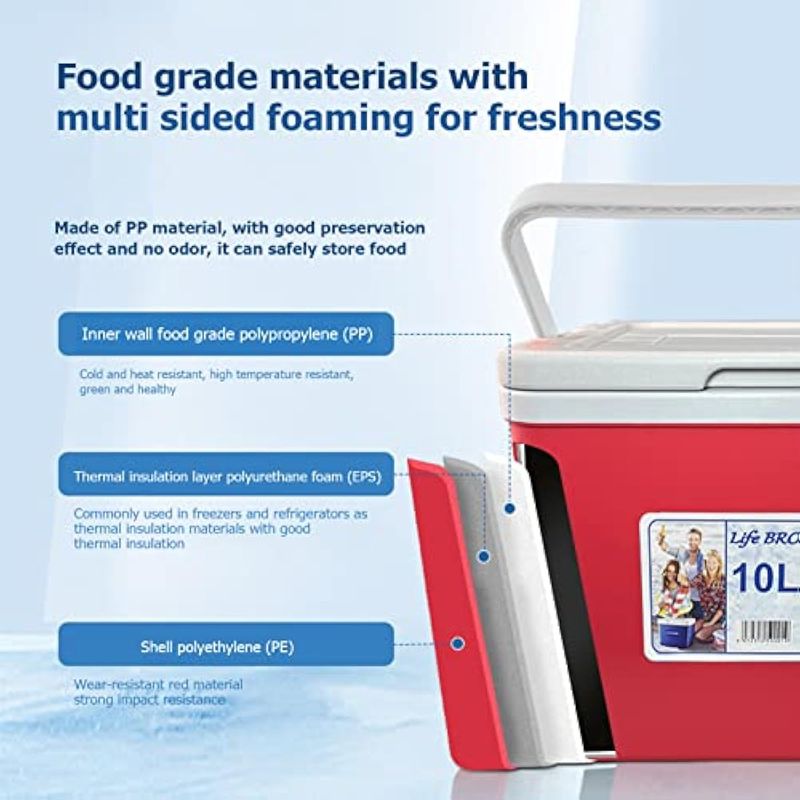 Materiales duraderos y construcción resistente: el exterior de este enfriador portátil está hecho de material de polietileno de alta calidad, es impermeable y resistente al desgaste y tiene una construcción fuerte y duradera. Y el interior está hecho de material EPS de alta calidad, que es seguro y saludable, puede poner mejor tus alimentos y bebidas se mantendrán más fríos y más tiempo en este refrigerador.