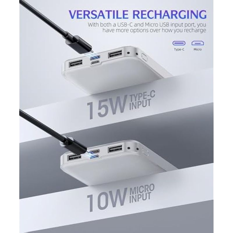 Cargador portátil con 5V 3.1A 2 puertos de salida USB, que pueden cargar rápidamente 2 dispositivos al mismo tiempo. Puedes compartir con tus compañeros para deshacerte de las preocupaciones sobre la duración de la batería de tu teléfono. Los puertos de entrada USB C y Micro USB pueden recargar completamente la batería en 4-5 horas a 5V 2.0A.