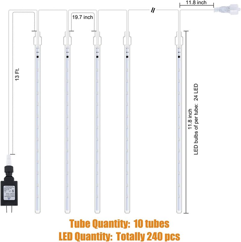 Luces de lluvia de meteoritos para exteriores, 16 pulgadas, 10 tubos, 360 luces LED de nieve, luces
