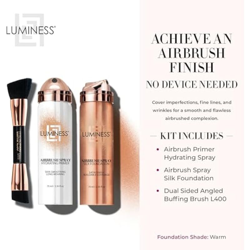 Flawless Complexion: Cover imperfections, fine lines and wrinkles with the LUMINESS Airbrush Spray Silk Foundation Starter Kit. Achieve an airbrushed look with primer and foundation spray formulated with hydrating ingredients to replenish and lock in moisture. Includes 1 Hydrating Primer, 1 Silk Foundation, and 1 Dual Sided Angled Buffing Brush L400. Foundation Shade: Warm