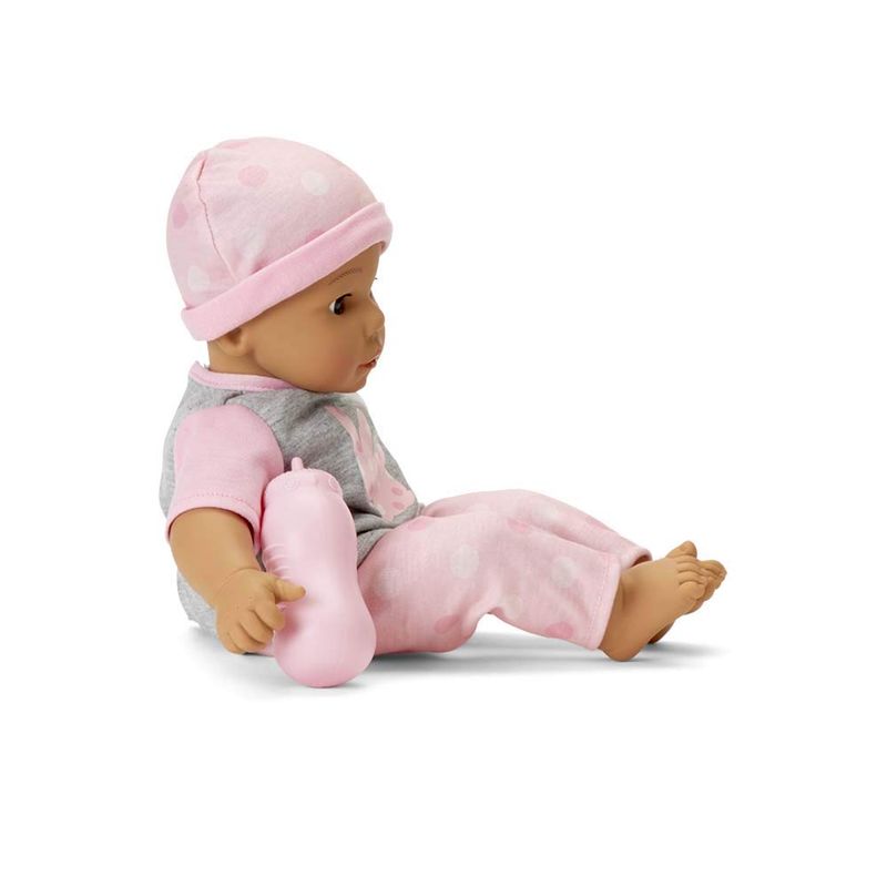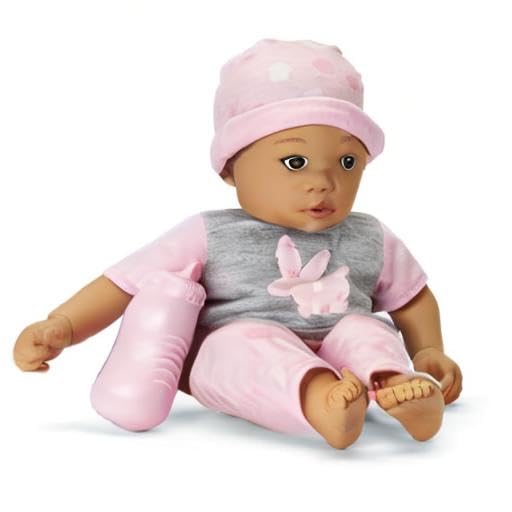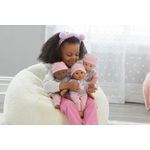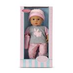 Detalles: vestido con una adorable camiseta de conejo, leggings de lunares y gorra a juego; cuenta con piel clara y ojos azules e incluye botella; se envía en una caja con ventana; la muñeca se limpia con un paño húmedo