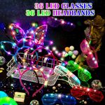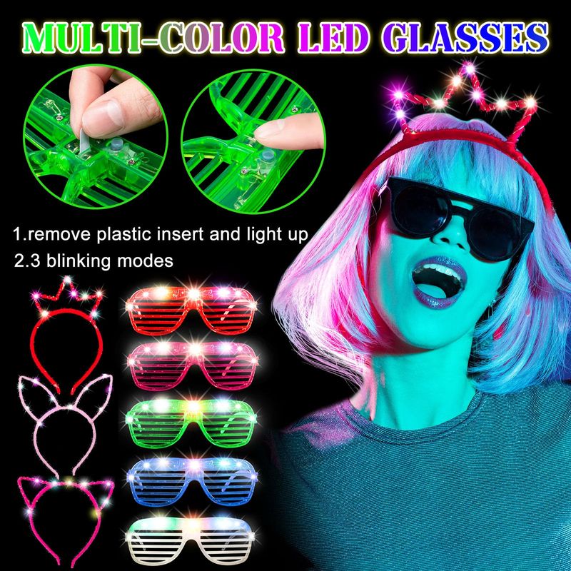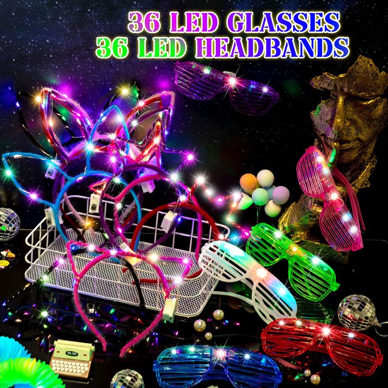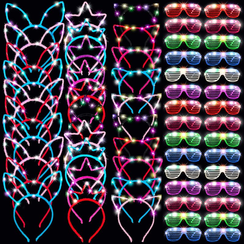 MAITYS JUEGO DE GAFAS CON LUZ LED, DIADEMA LED LUMINOSA, DIADEMA CON OREJAS DE GATO, DIADEMA DE OREJAS DE CONEJO, DIADEMA DE CORONA, GAFAS DE SOL BRILLANTES DE COLORES QUE BRILLAN EN LA OSCURIDAD, REGALOS DE FIESTA, SUMINISTROS DE CUMPLEAñOS (72 PIEZAS)
