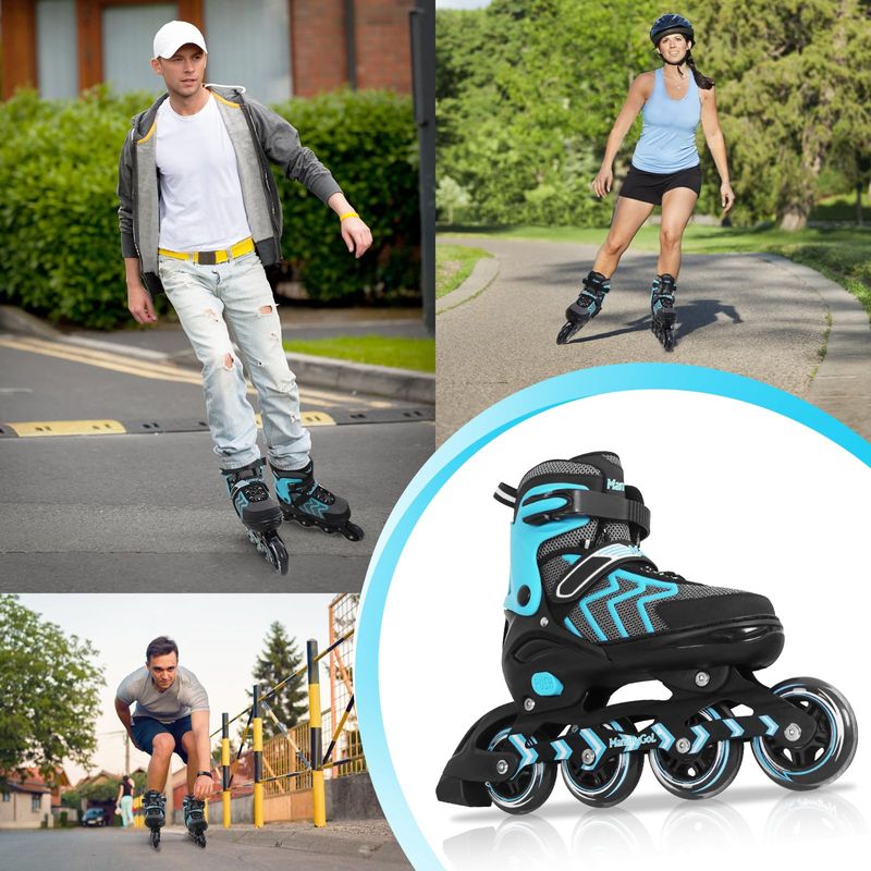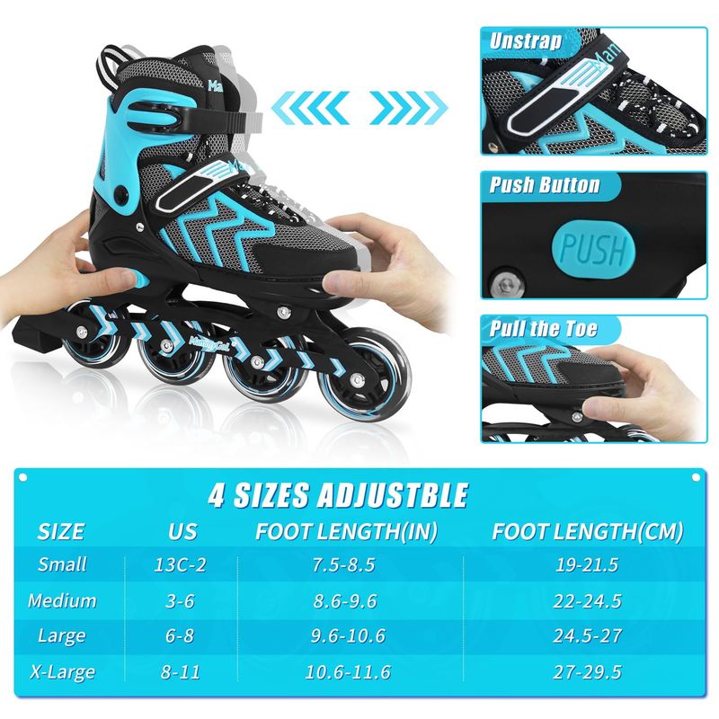 Patines en línea ajustables para adultos y adolescentes: los patines en línea MammyGol satisfacen las necesidades de los patinadores principiantes y jóvenes. Compra de acuerdo con la escala de tamaño proporcionada por nosotros, puedes ajustar fácilmente al tamaño que quieras simplemente presionando el botón.