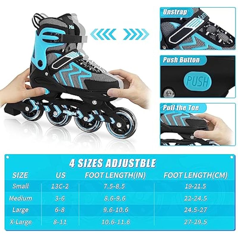Patines en línea ajustables para adultos y adolescentes: los patines en línea MammyGol satisfacen las necesidades de los patinadores principiantes y jóvenes. Compra de acuerdo con la escala de tamaño proporcionada por nosotros, puedes ajustar fácilmente al tamaño que quieras simplemente presionando el botón.