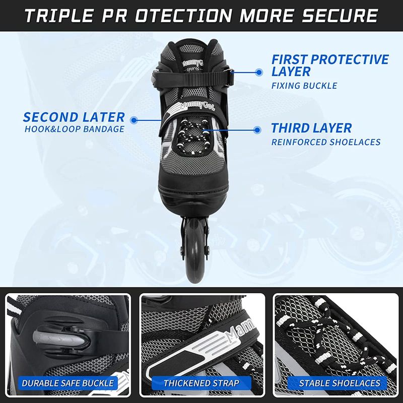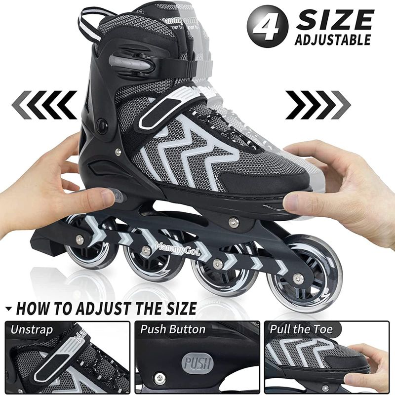 Patines en línea ajustables para adultos y adolescentes: los patines en línea MammyGol satisfacen las necesidades de los patinadores principiantes y jóvenes. Compra de acuerdo con la escala de tamaño proporcionada por nosotros, puedes ajustar fácilmente al tamaño que quieras simplemente presionando el botón.