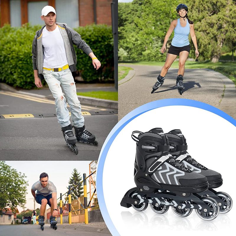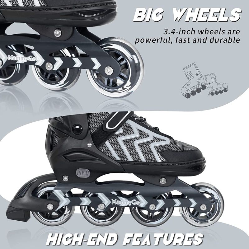 Patines en línea ajustables para adultos y adolescentes: los patines en línea MammyGol satisfacen las necesidades de los patinadores principiantes y jóvenes. Compra de acuerdo con la escala de tamaño proporcionada por nosotros, puedes ajustar fácilmente al tamaño que quieras simplemente presionando el botón.