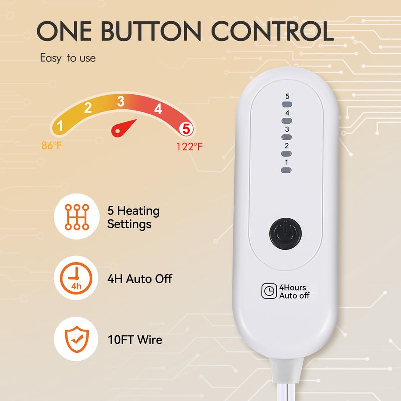 Funcionamiento sencillo y apagado automático: un botón para encenderlo y luego elegir su temperatura personalizada 86-122°F entre cinco niveles de calefacción. La manta térmica de 50 x 60 pulgadas se apaga automáticamente después de 4 horas y la manta eléctrica de 62 x 84 pulgadas se apaga automáticamente después de 10 horas. Nuestra manta térmica es ideal para tu almuerzo y sueño nocturno.